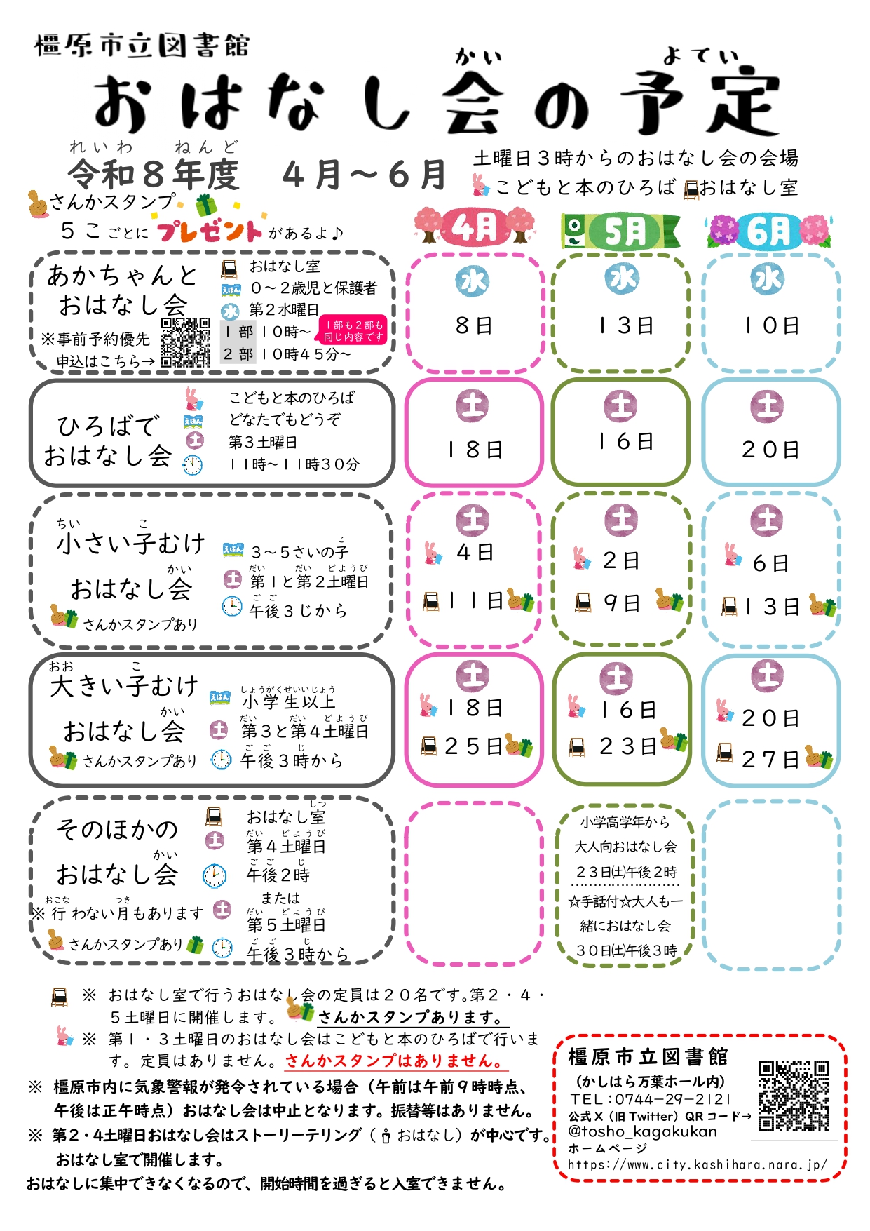 各おはなし会の詳細プログラムについては、公式X『橿原市立図書館・こども科学館(かしはら万葉ホール)』での配信、図書館メールマガジンでの配信、図書館1階おはなし室前にて掲示しています。
