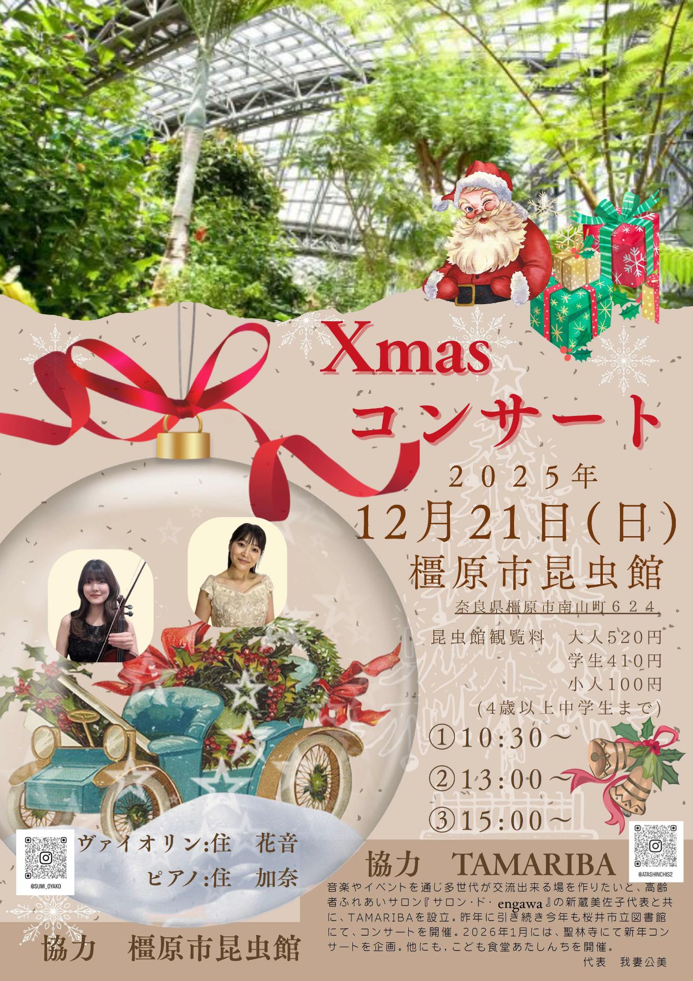 放蝶温室にて住親子によるクリスマスコンサートを開催します。ヴァイオリンとピアノの音色が放蝶温室に響き、クリスマスに素敵な体験になること間違いなし!必要なのは入館料のみですので、ぜひお立ち寄りください。 |