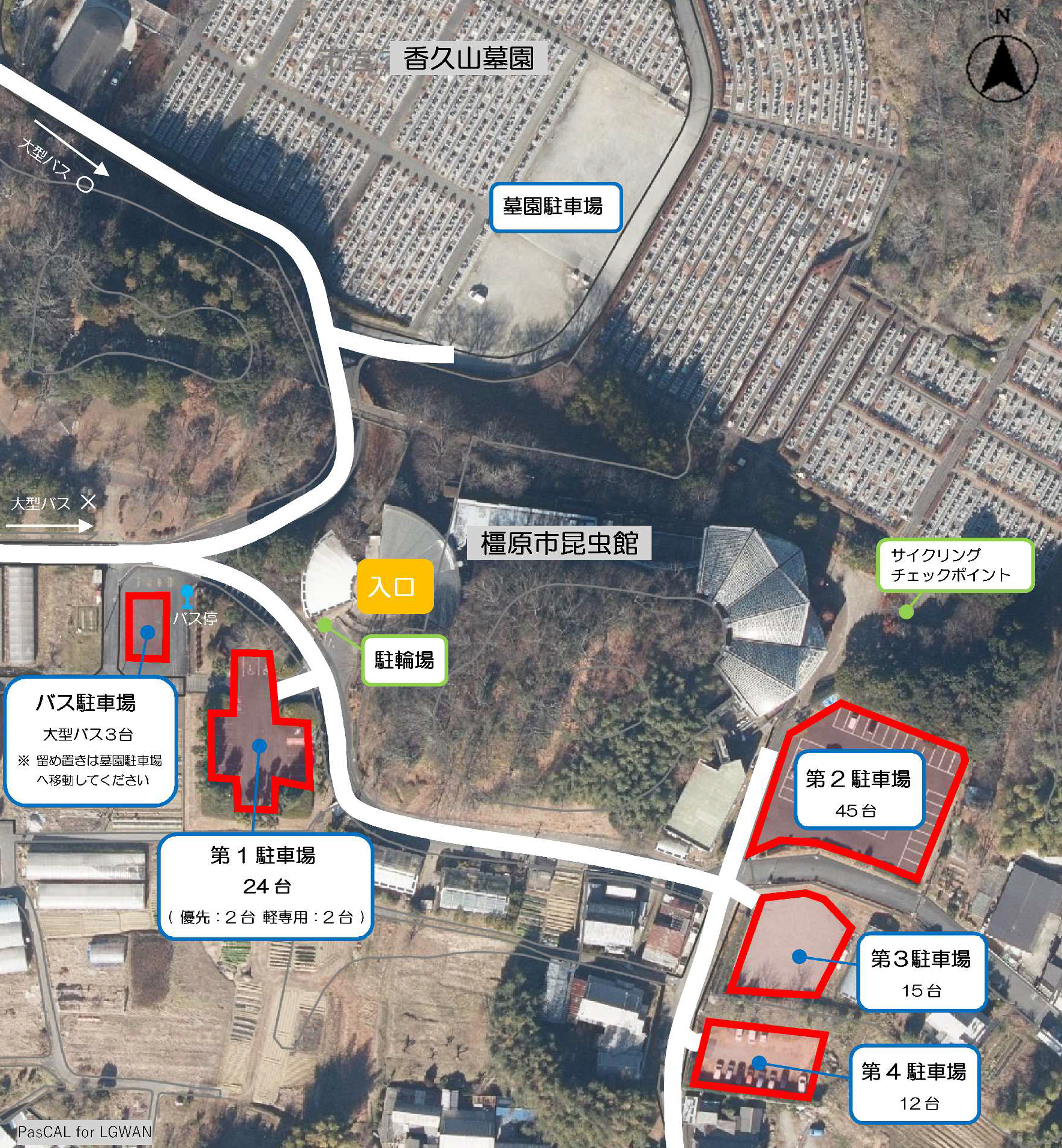 ※ バス駐車場でお客様を降ろされてからしばらく留め置きする必要がある場合は、速やかに昆虫館北側墓園駐車場へバスの移動をお願い致します。