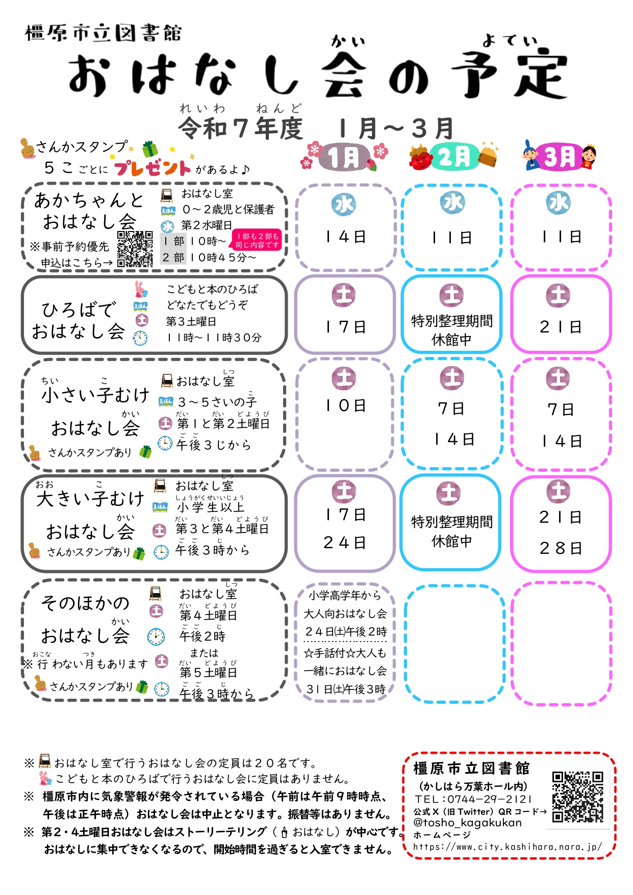 各おはなし会の詳細プログラムについては、公式X『橿原市立図書館・こども科学館(かしはら万葉ホール)』での配信、図書館メールマガジンでの配信、図書館1階おはなし室前にて掲示しています。