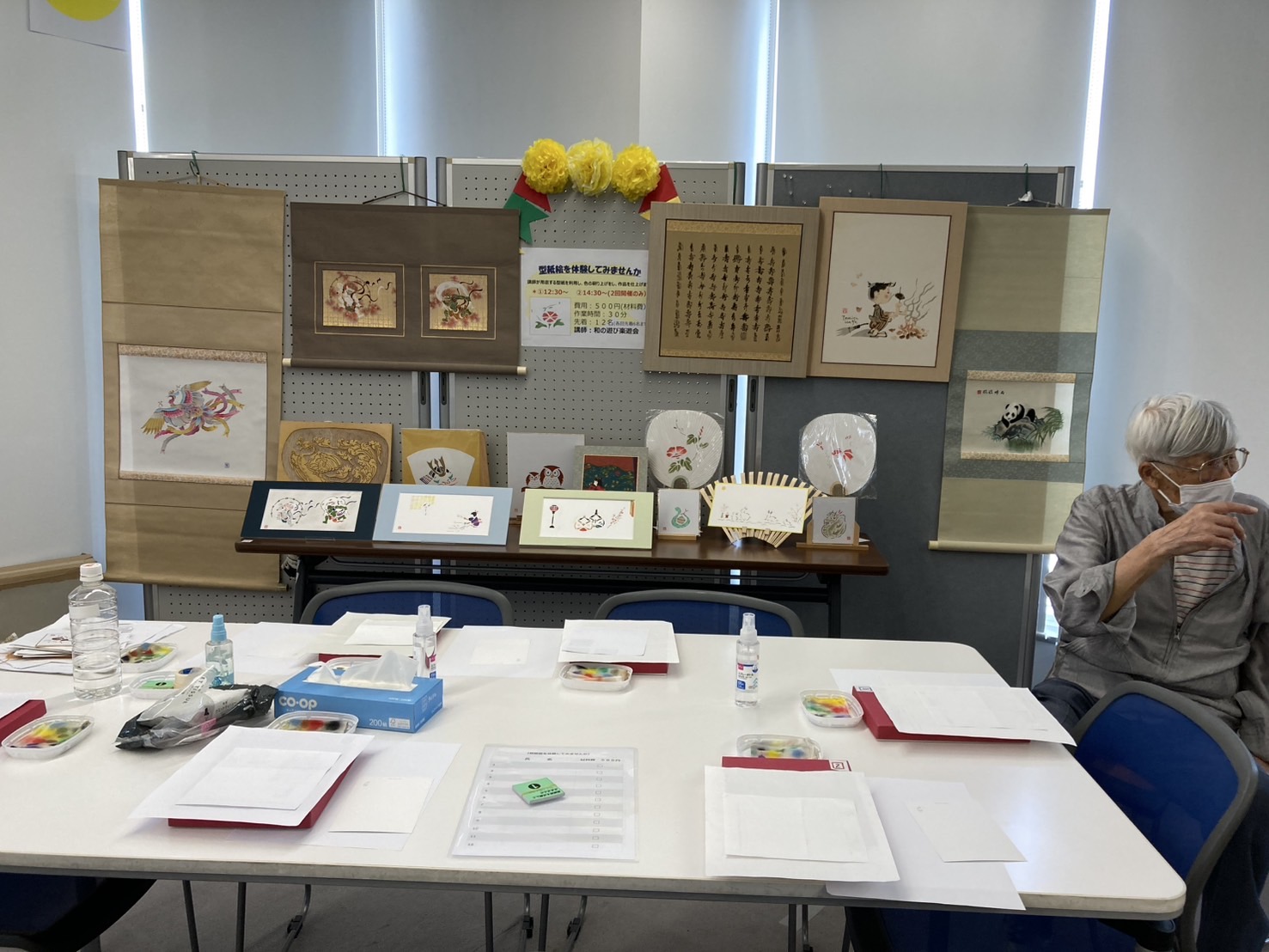和の遊び楽遊会は、型紙絵の出前講座です。型紙を利用して色を刷り上げます。簡単でどなたでも楽しめるそうです。