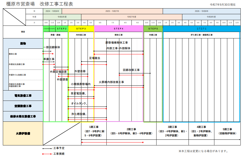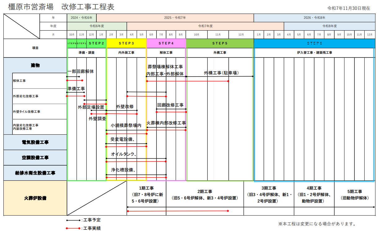 橿原市営斎場は、昭和62年3月に竣工、同年6月に供用を開始しました。これまで定期的に修繕等を行ってまいりましたが、稼働から35年余りが経過し、施設の老朽化が懸念されることから、下記の通り改修工事を行います。