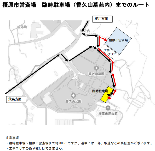 橿原市営斎場に駐車できない場合、臨時駐車場(香久山墓苑内)に駐車をお願いします。