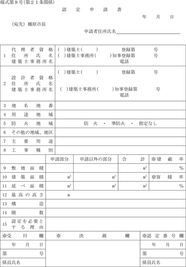 第21条 建築主は、県条例第8条第3項第2号、第11条第2項第2号、第19条の2又は第19条の3第2項第2号の規定による認定を受けようとするときは、認定申請書(