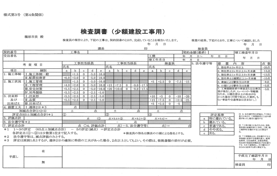 (1) 建設工事請負契約書により契約金額500万円以上にかかる土木工事、土地改良工事及び水道工事については、土木工事成績採点表[竣工、出来形](