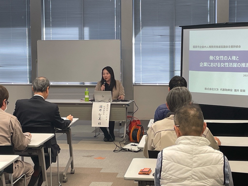 講師には、株式会社ICB 代表取締役の瀧井智美氏をお招きしました。研修では、「働く女性が直面する人権課題」や「その課題をどのように乗り越えていくのか」についてご講義いただくとともに、全国の自治体や企業における女性活躍推進の取組事例についてもご紹介いただきました。