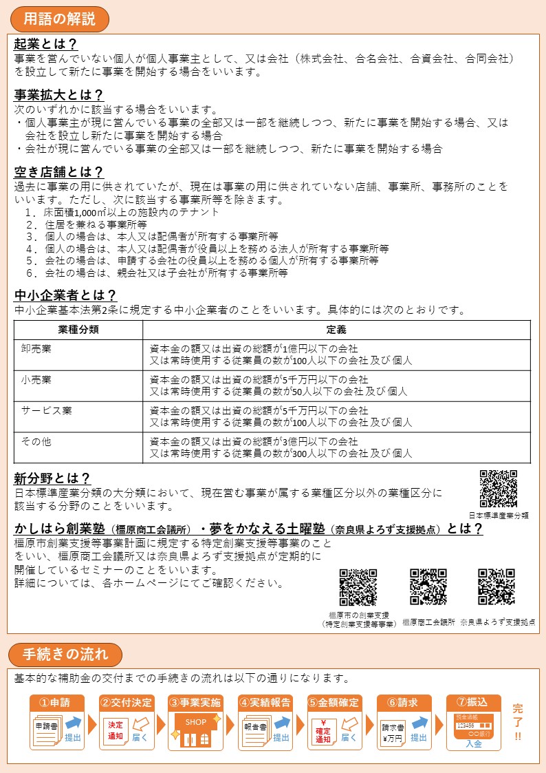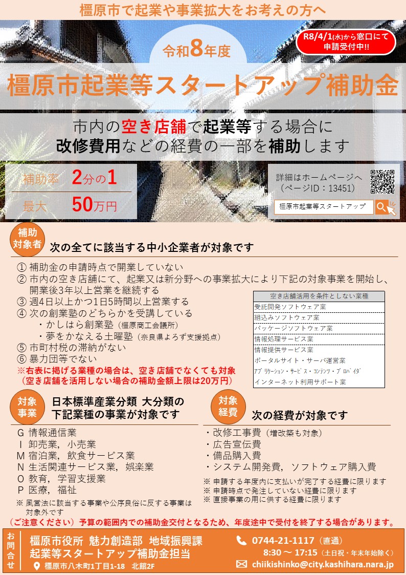 令和8年4月1日(プレスリリース)「橿原市起業等スタートアップ補助金」 を拡充します! 更新日:2026年04月01日 ページID: 20162 詳細は添付資料をご覧ください。 令和8年4月1日(プレスリリース) ~情報通信業を新たに対象に追加、空き店舗以外での起業も一部可能に~ 「橿原市起業等スタートアップ補助金」 を拡充します!(PDFファイル:469.3KB) 【チラシ表】(JPEG:333.7KB) 【チラシ裏】(JPEG:268.2KB)