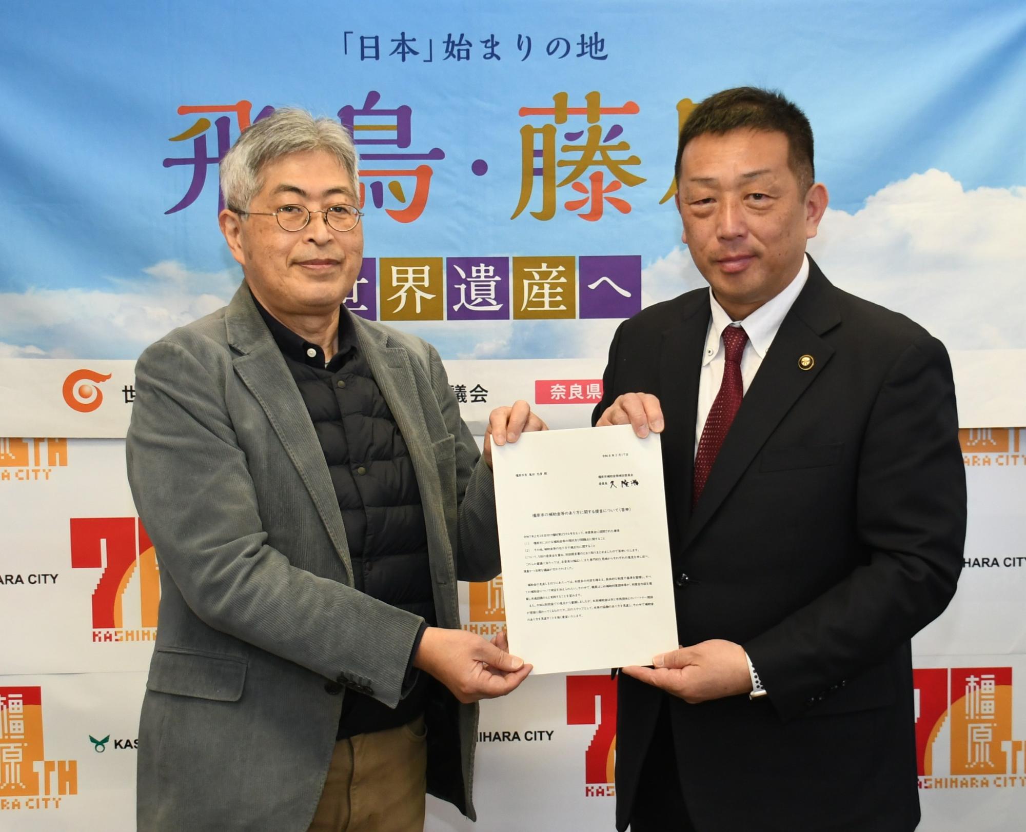 全5回の橿原市補助金等検討委員会の審議が終了し、令和8年2月17日に答申式が開催され、久委員長(写真左)から亀田市長(写真右)に対し、答申が行われました。