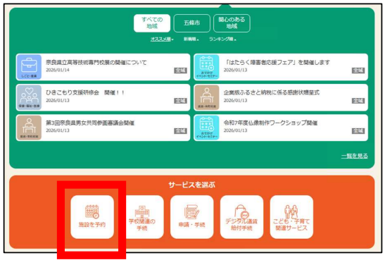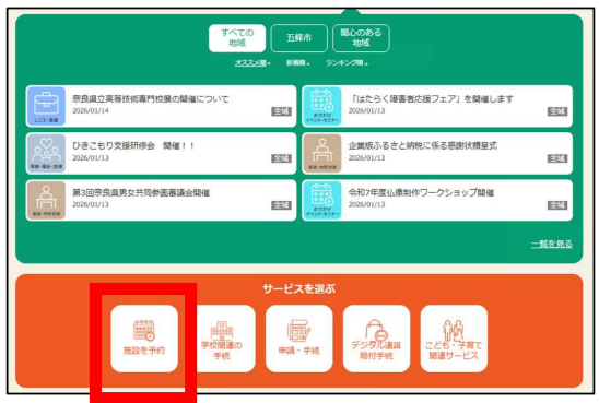 (1)奈良スーパーアプリのトップ画面から「施設を予約」を押す。