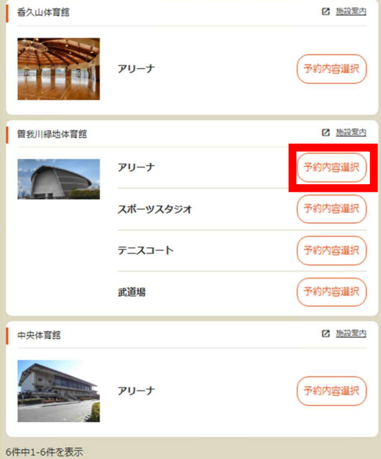(2)確認したい施設の設備の「予約内容選択」を押す。