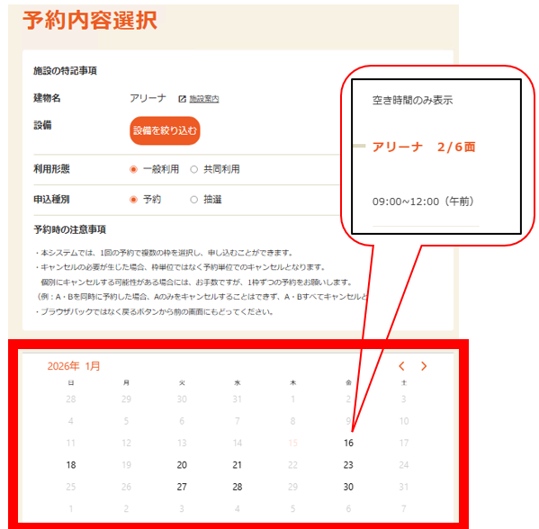 ※選択できない日程は、「空きがない」、「オンラインでの予約受付日前」または「休館日」のいずれかです。