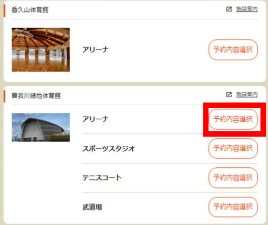 (3)空き状況を確認したい施設の設備の「予約内容選択」を押す。