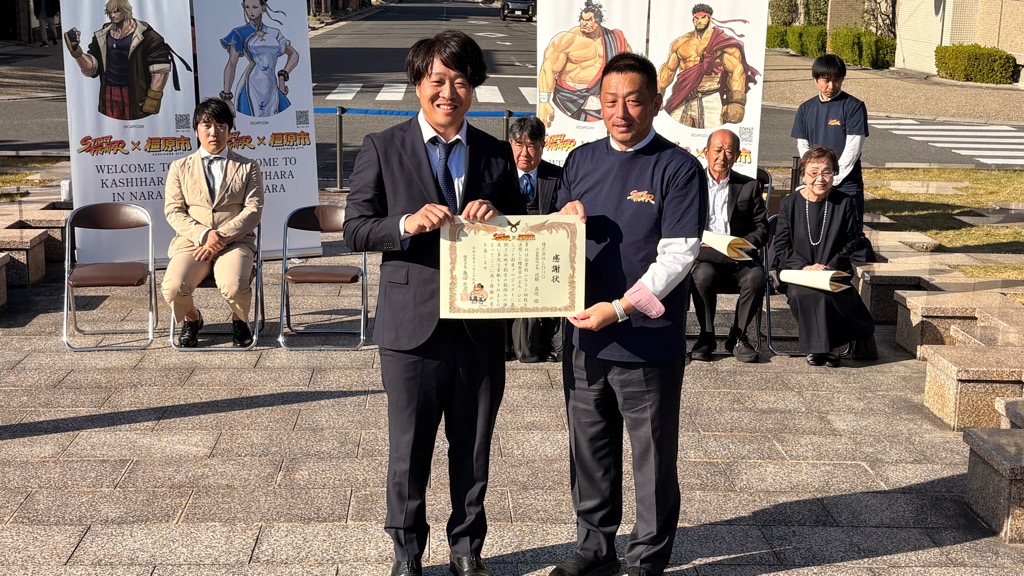 本市の地方創生の取組みにご賛同・ご支援を賜り、厚く御礼申し上げます。、地方創生応援税制(企業版ふるさと納税制度)を活用した寄附として、本市の地方創生プロジェクト『ストリートファイター銅像等設置プロジェクト』にご寄附をいただきました。このご厚志に対し、橿原市より感謝状を贈呈いたしました。