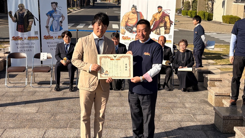 株式会社Japan Medical Innovation様より、地方創生応援税制(企業版ふるさと納税制度)を活用した寄附として、本市の地方創生プロジェクト『ストリートファイター銅像等設置プロジェクト』にご寄附をいただきました。このご厚志に対し、令和7年11月29日(土曜日)に行われました、「エドモンド本田銅像除幕式」において、橿原市より感謝状を贈呈いたしました。本市の地方創生の取組みにご賛同・ご支援を賜り、厚く御礼申し上げます。