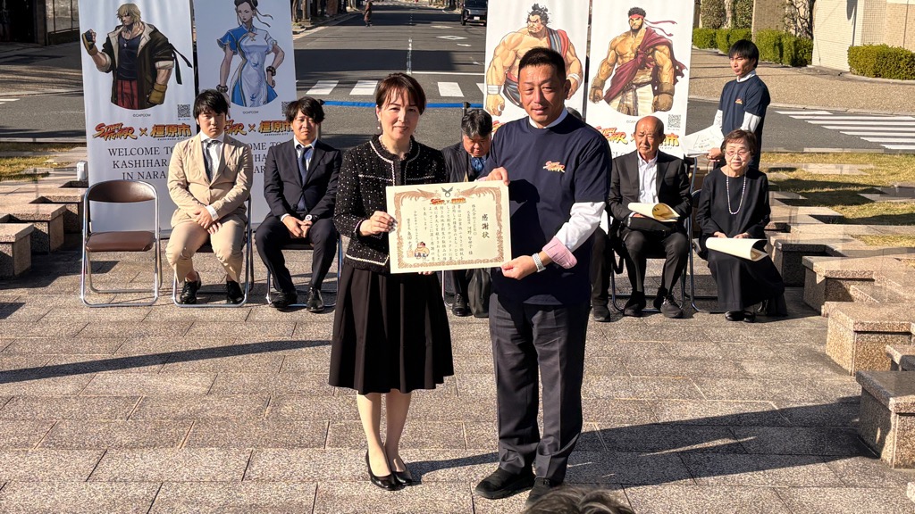 株式会社ZERO様より、地方創生応援税制(企業版ふるさと納税制度)を活用した寄附として、本市の地方創生プロジェクト『ストリートファイター銅像等設置プロジェクト』にご寄附をいただきました。このご厚志に対し、令和7年11月29日(土曜日)に行われました、「エドモンド本田銅像除幕式」において、橿原市より感謝状を贈呈いたしました。本市の地方創生の取組みにご賛同・ご支援を賜り、厚く御礼申し上げます。