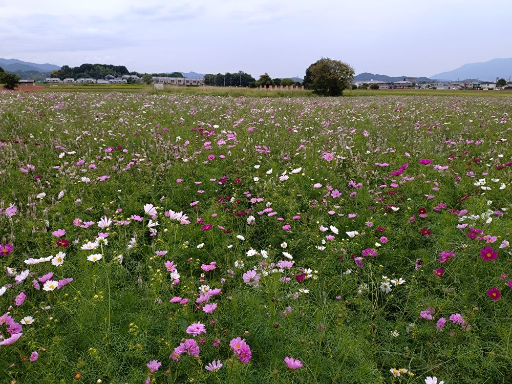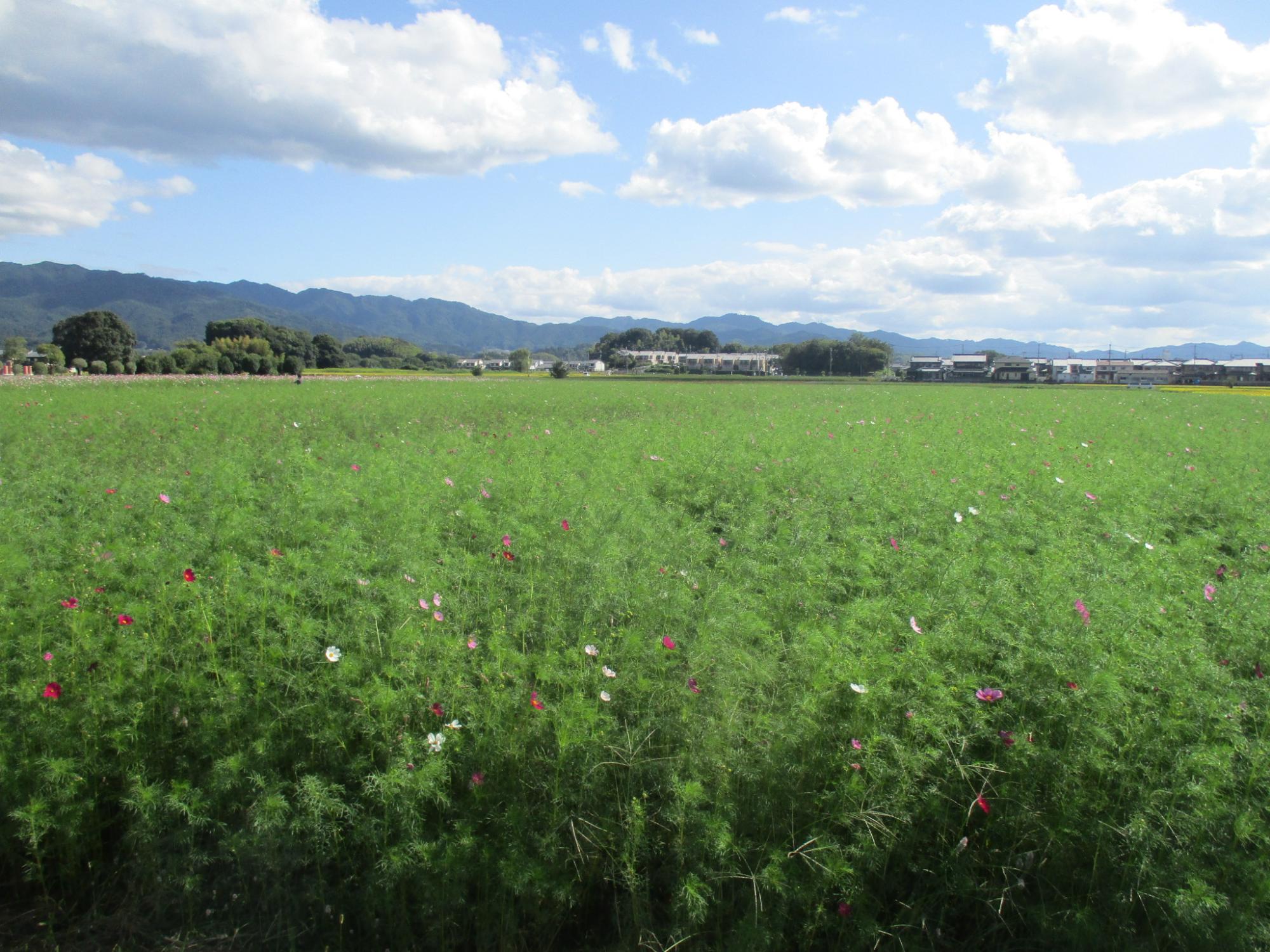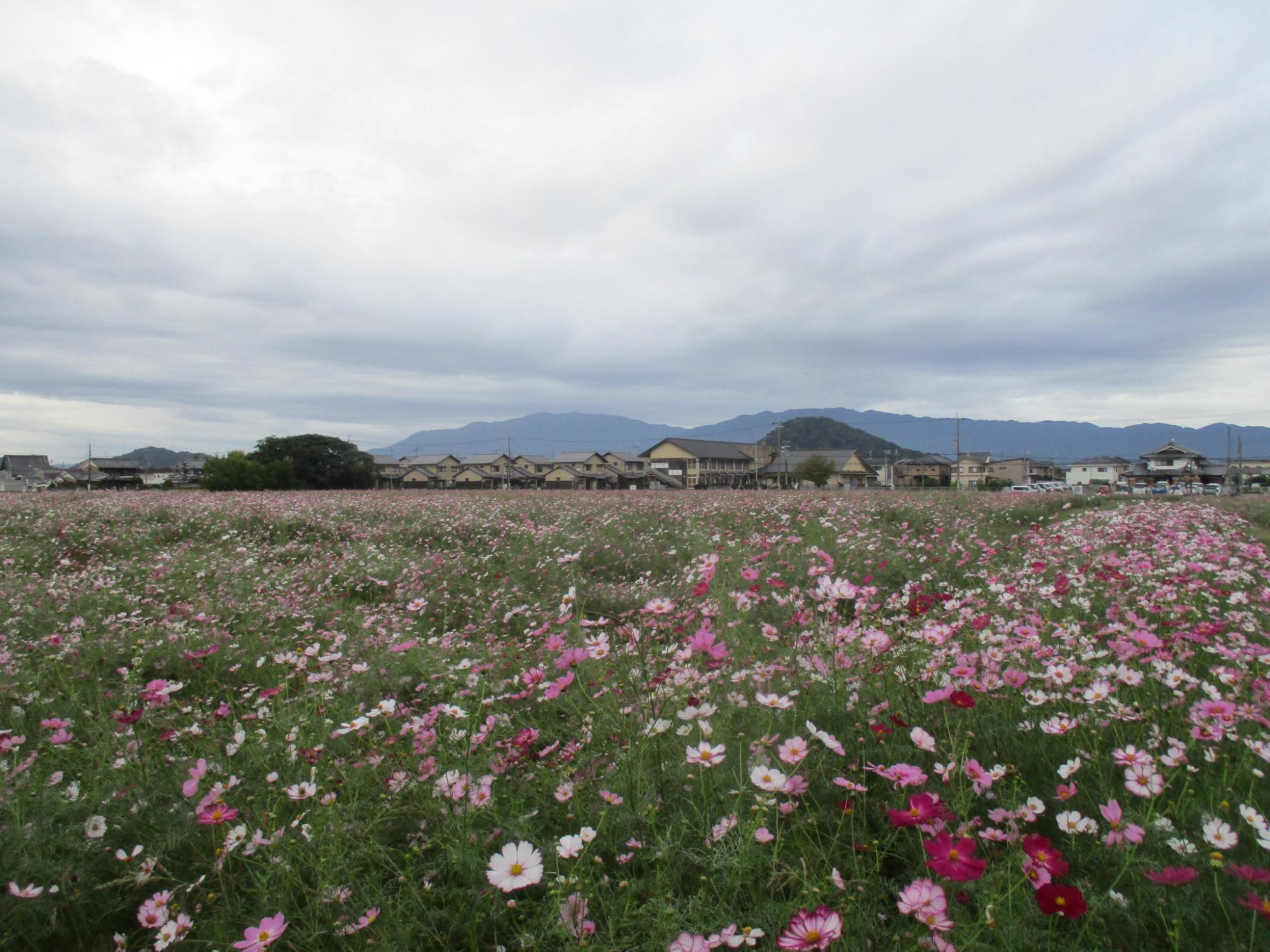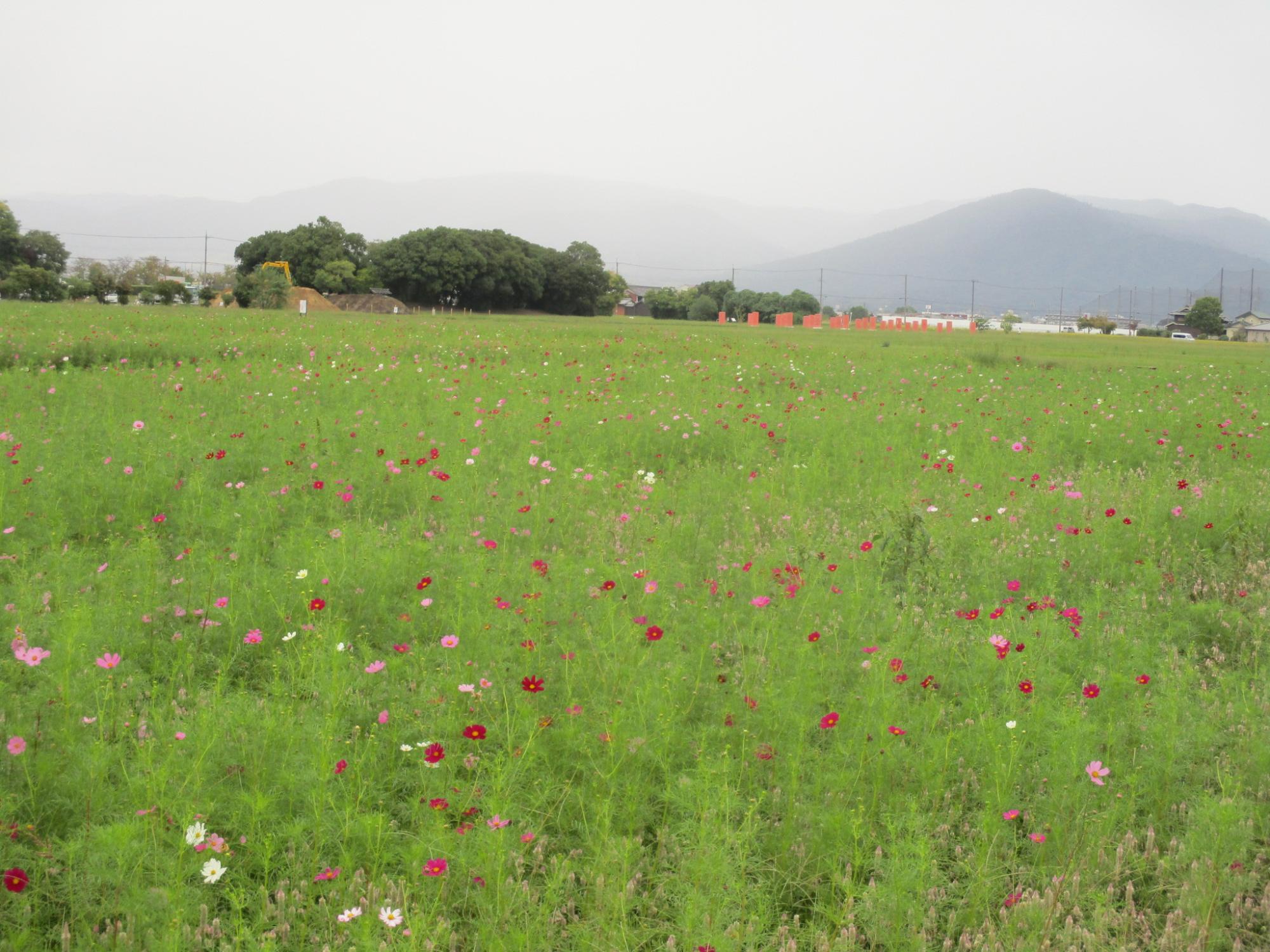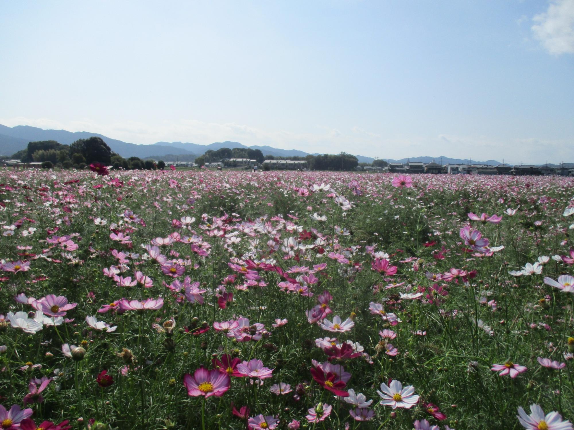 藤原宮跡では、季節の花々を植栽しています。秋ゾーンでは約2万4千平方メートルの広大な敷地に、4種類約240万本のコスモスが咲き乱れます。見ごろは例年ですと、10月上旬~10月下旬です。