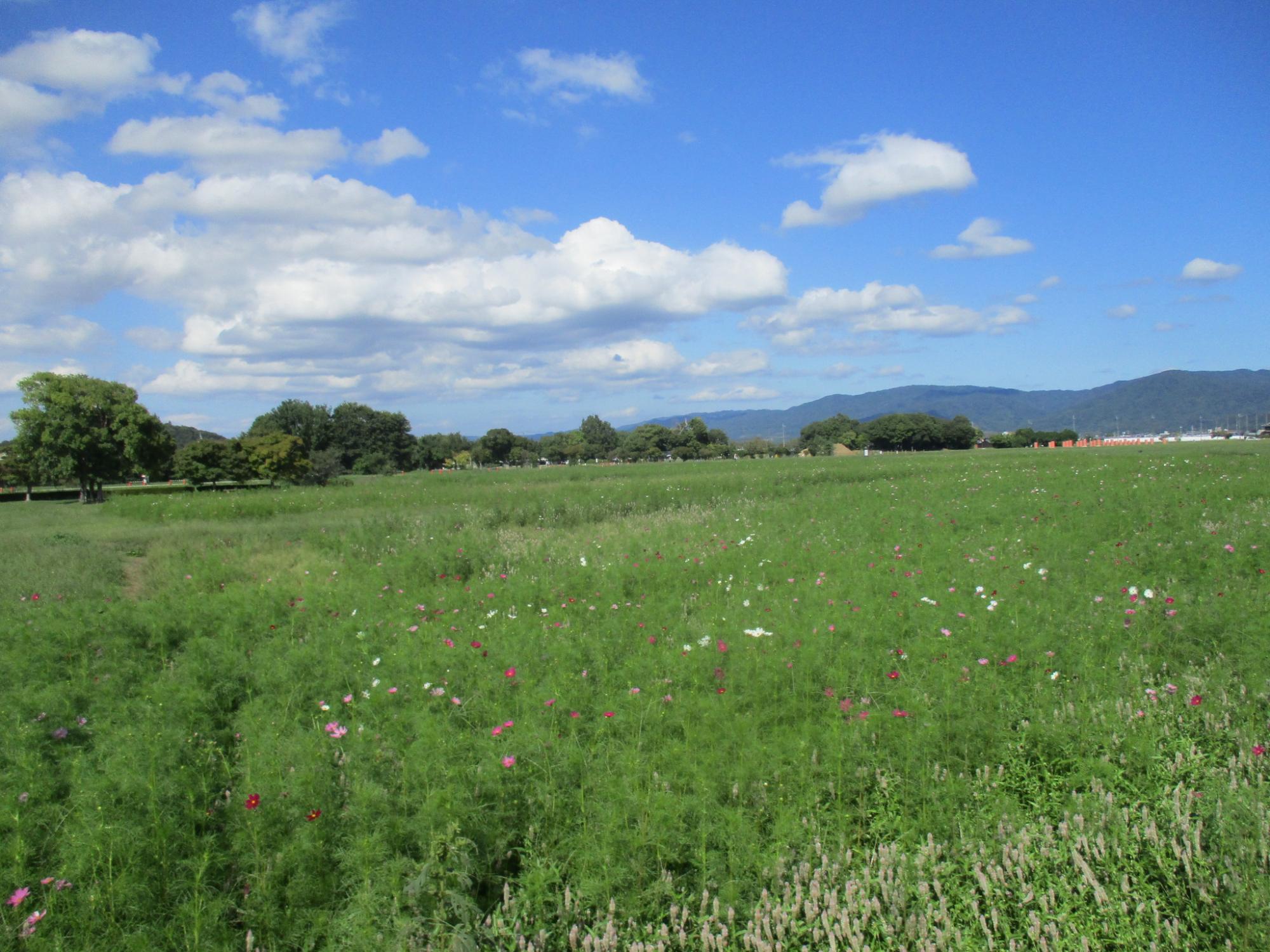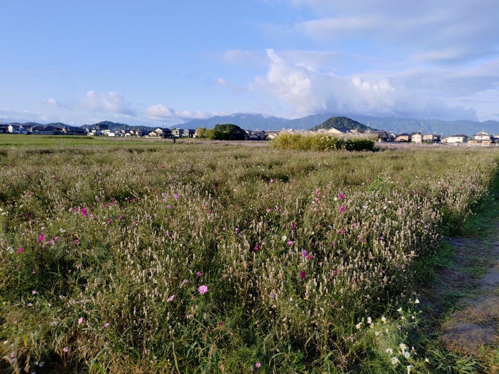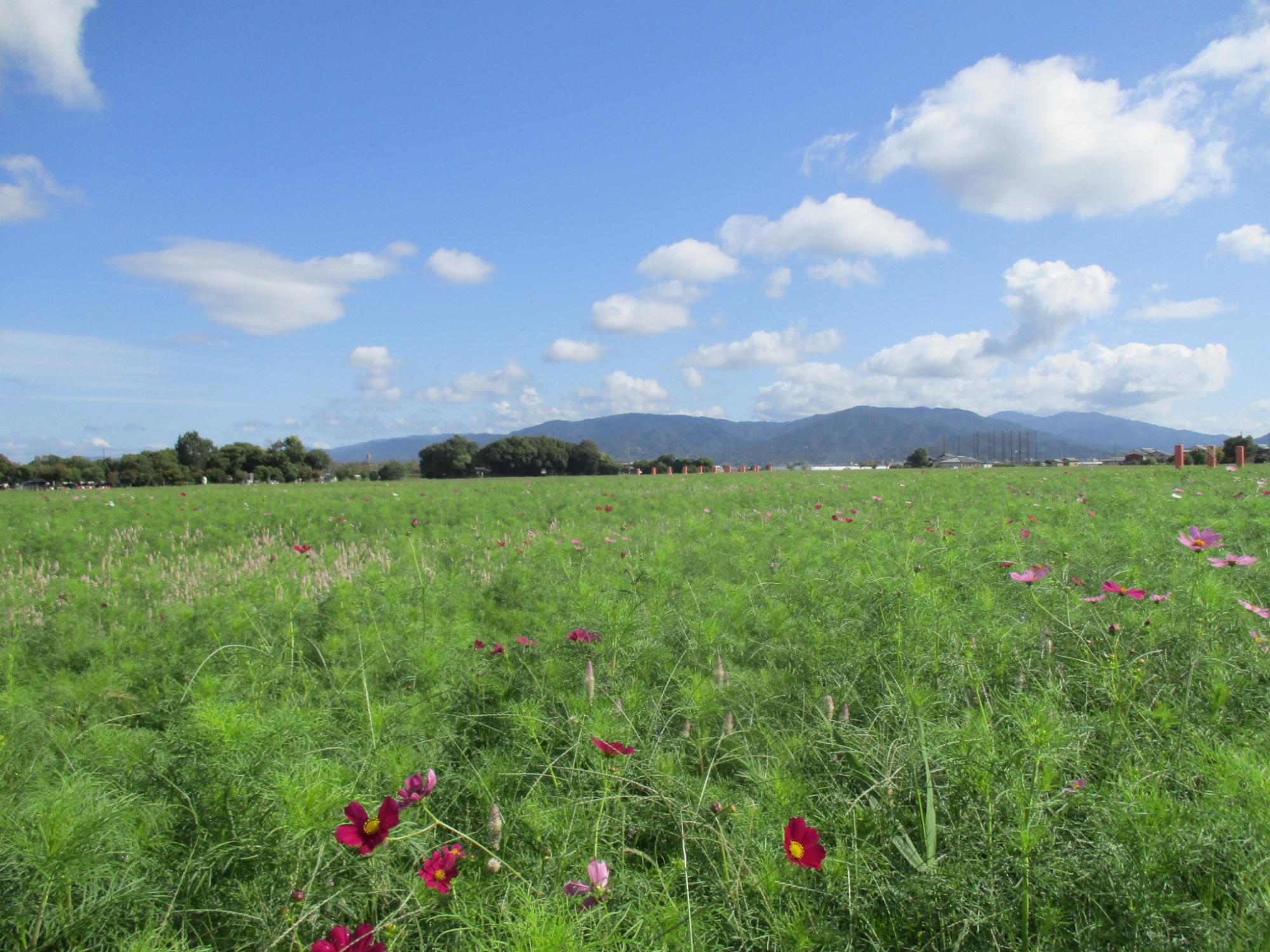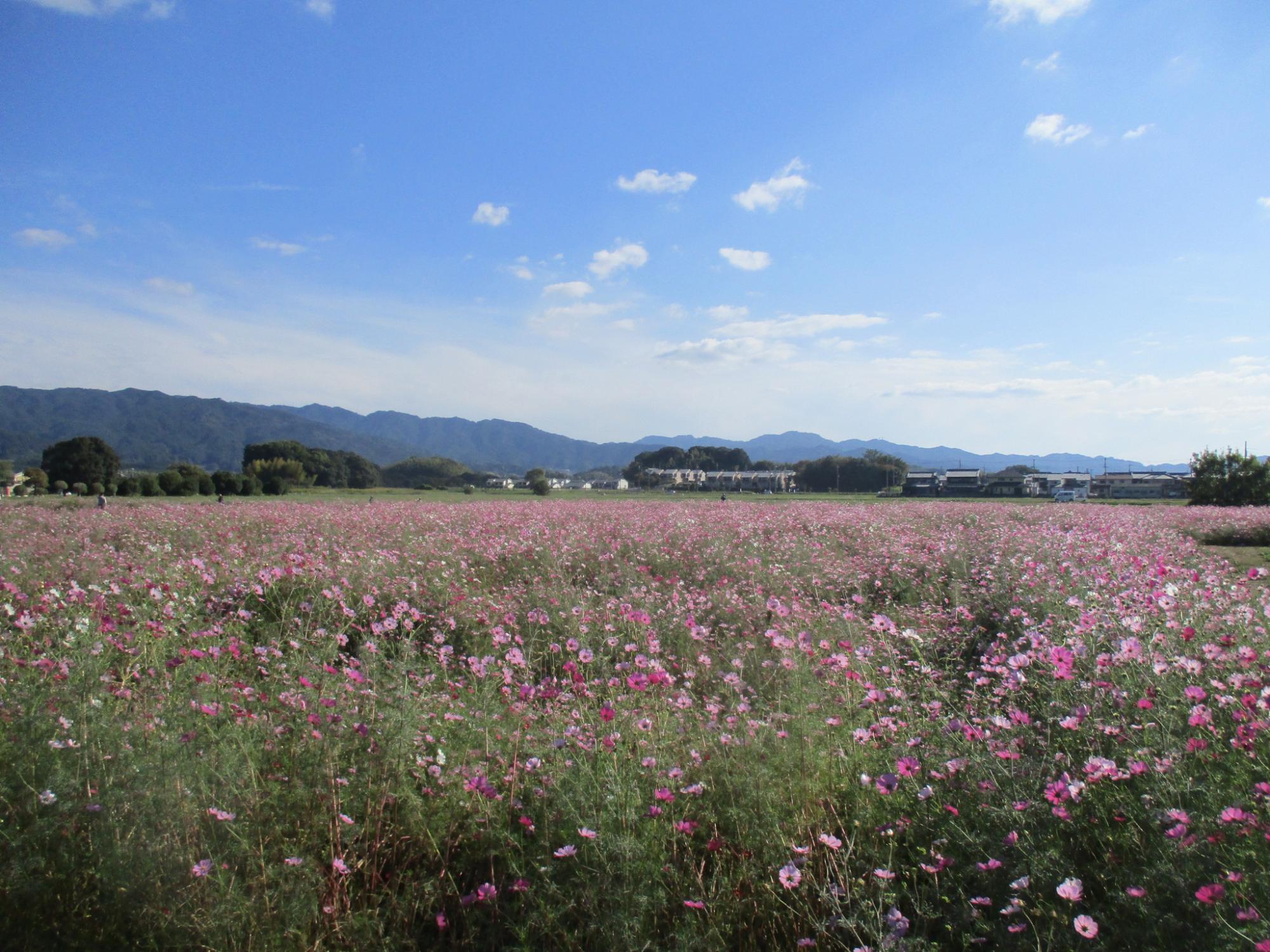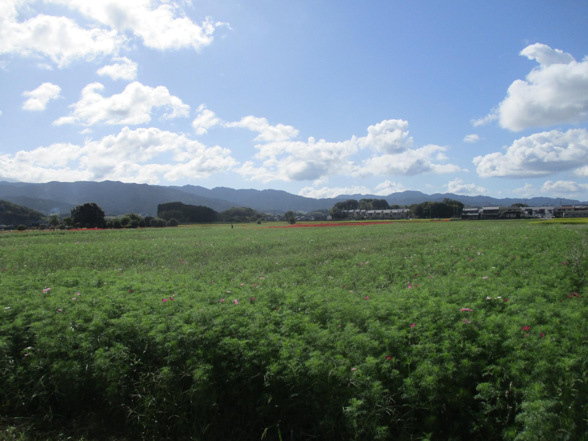 藤原宮跡では、季節の花々を植栽しています。秋ゾーンでは約2万4千平方メートルの広大な敷地に、4種類約240万本のコスモスが咲き乱れます。見ごろは例年ですと、10月上旬~10月下旬です。