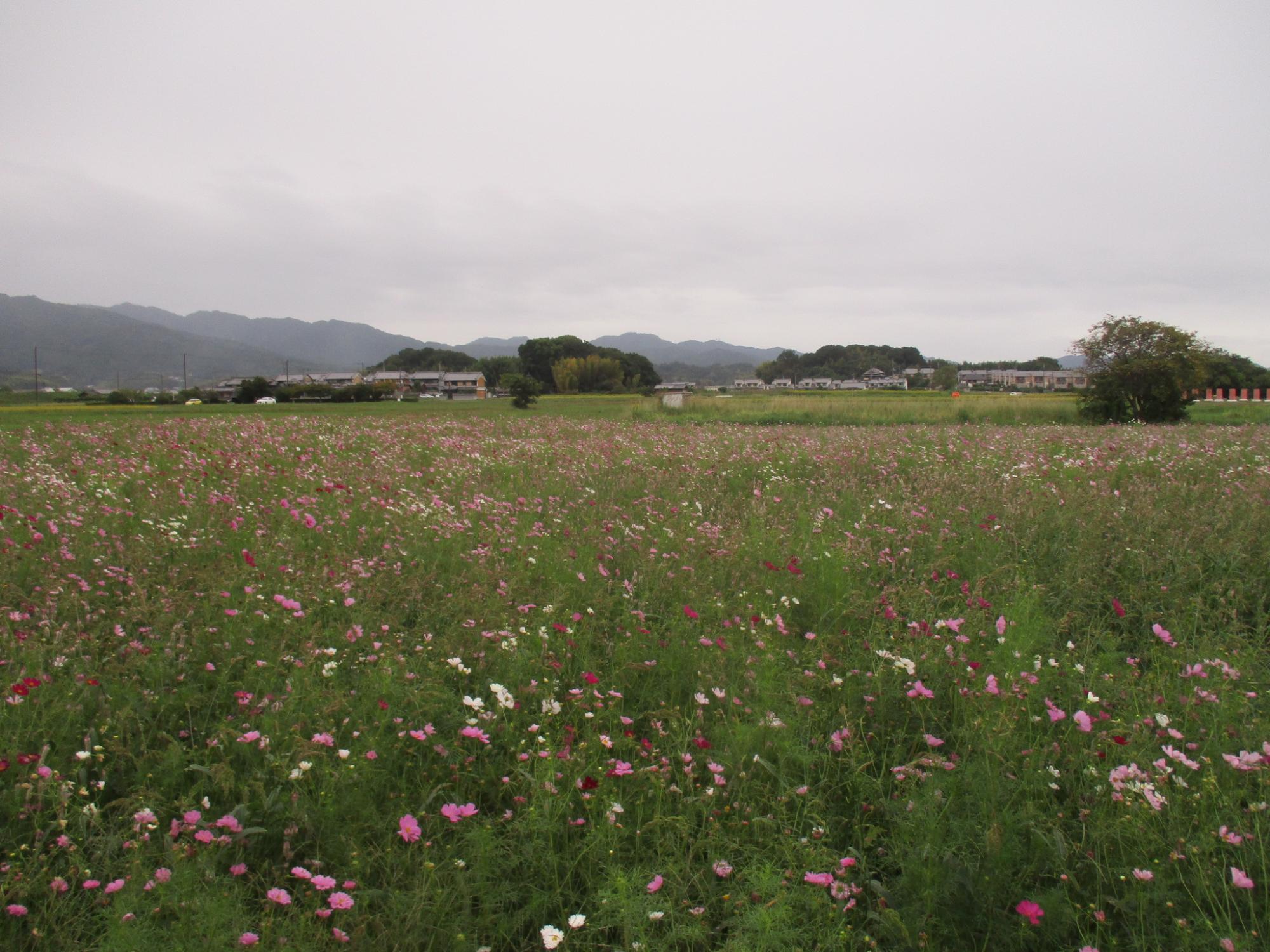雨が降った後は、ぬかるんでいたり水たまりのある場所もありますので、濡れにくく動きやすい靴をお勧めします。特にコスモスを植栽している周辺は滑りやすいので、見学の際はご注意ください。