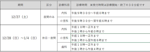 - 【12月28日(日曜日)~1月4日(日曜日)の午後5時以降に内科診療を希望される方へ】