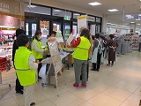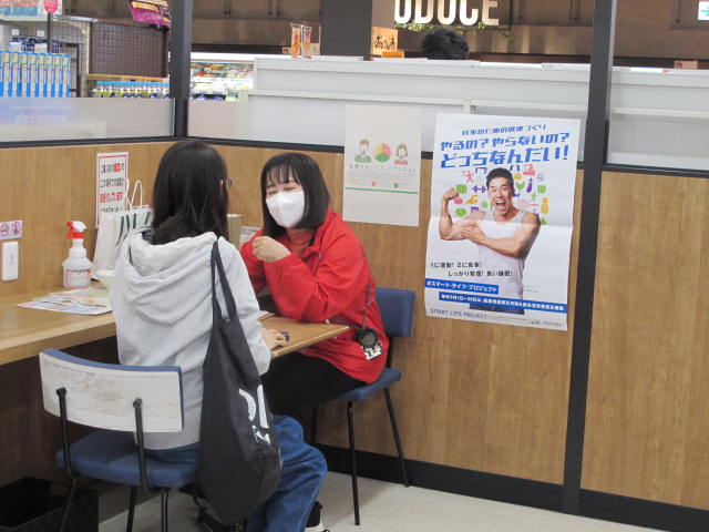 橿原市食生活改善推進員による野菜350gクイズと近畿大学の学生の皆さんによる減塩診断、奈良県やさしおベジ増し認定お惣菜の試食、減塩の展示を実施。86名の方に記念品をプレゼントしました。