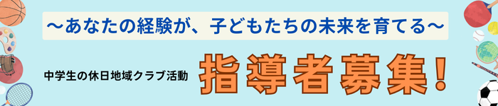 橿原市では中学校部活動の地域展開を推進するため、地域クラブ活動指導者の確保に向けて「橿原市地域クラブ活動指導者人材バンク」を開設いたしました。子どもたちがスポーツ・文化芸術活動に継続して親しむことができる機会を確保していくためには、地域の皆様の協力が大変重要となります。地域の皆様には、是非指導者としての登録をよろしくお願いします。子どもたちの未来へつなげていく取組に、教育に従事されていた方、部活動(スポーツ・文化)経験者の皆様、そして、現在も様々な分野で活動されている皆様のお力をお貸しください。