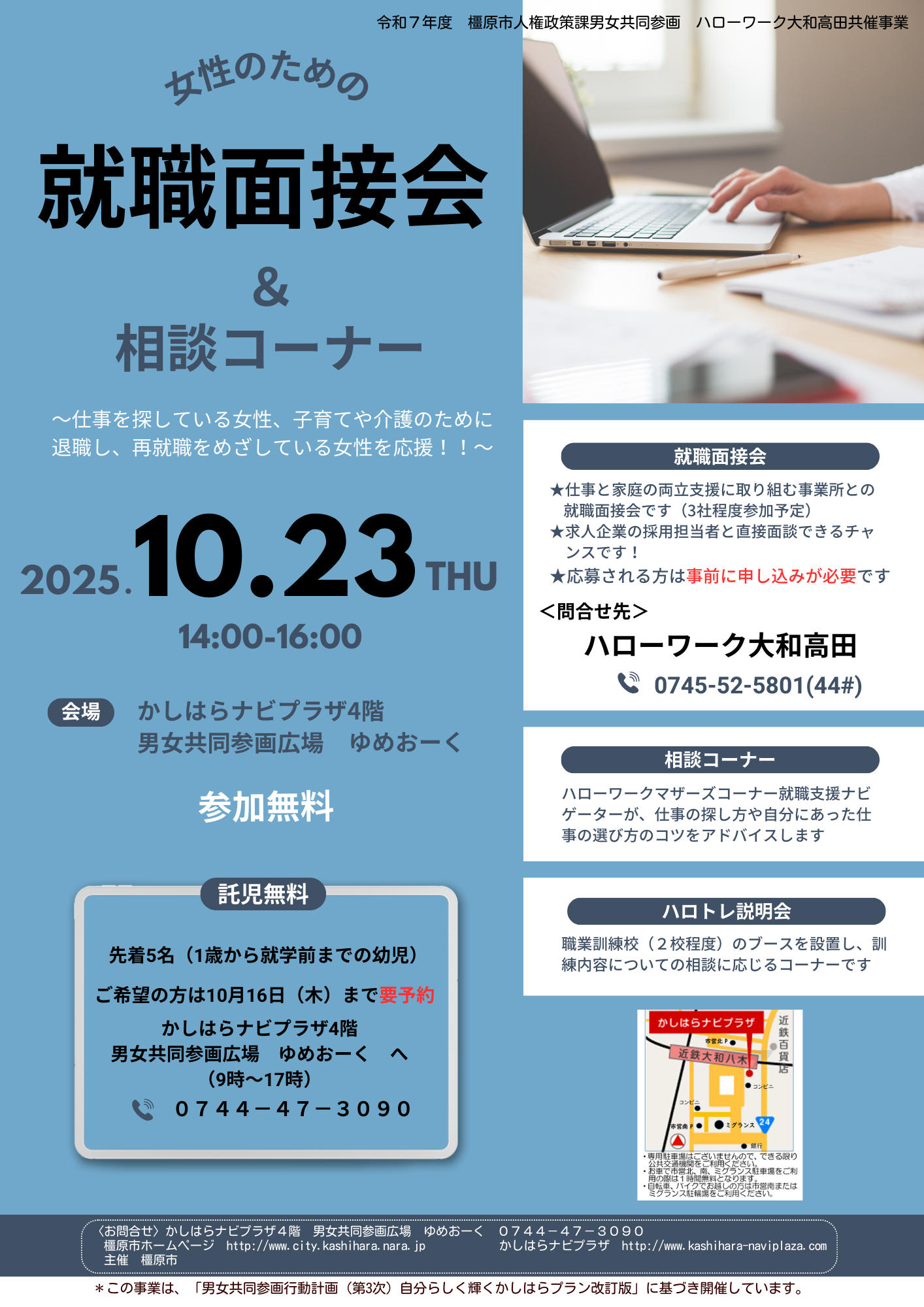 かしはらナビプラザ4階男女共同参画広場ゆめおーく(9時~17時)