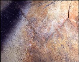 また別の壷の口縁部の内側には、龍と思われる画像が描かれていました。龍は想像上の動物のため、中国製の銅鏡などに描かれた具象化された龍とは異なり、絵画土器のモチーフとなった龍は四足がなく、足はヒレ状のもので表現され、体をくねらせた形状で描かれており、頭部は時代が下るにつれ省略化されるようになっていきます。中曽司遺跡の龍は一部ですが、体部の下にヒレ状の突起が表現されており、体部は平行する直線で表現されています。龍が描かれた絵画土器は水に関わる遺構から出土した例が多いとの指摘もあり、水に関わる祭祀に用いられた可能性も考えられます。