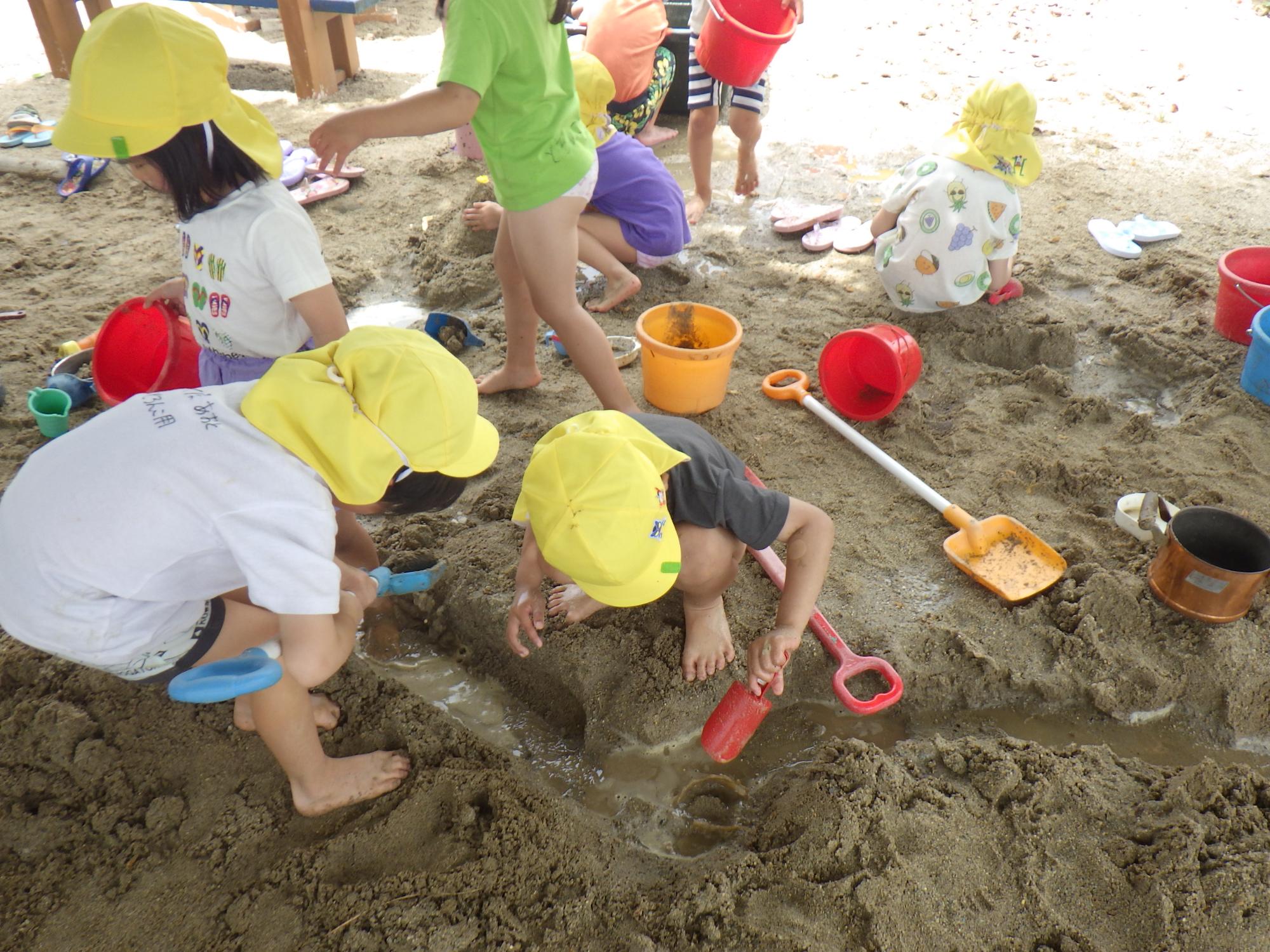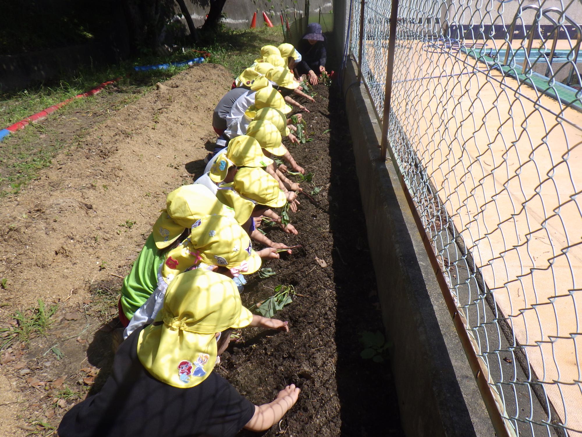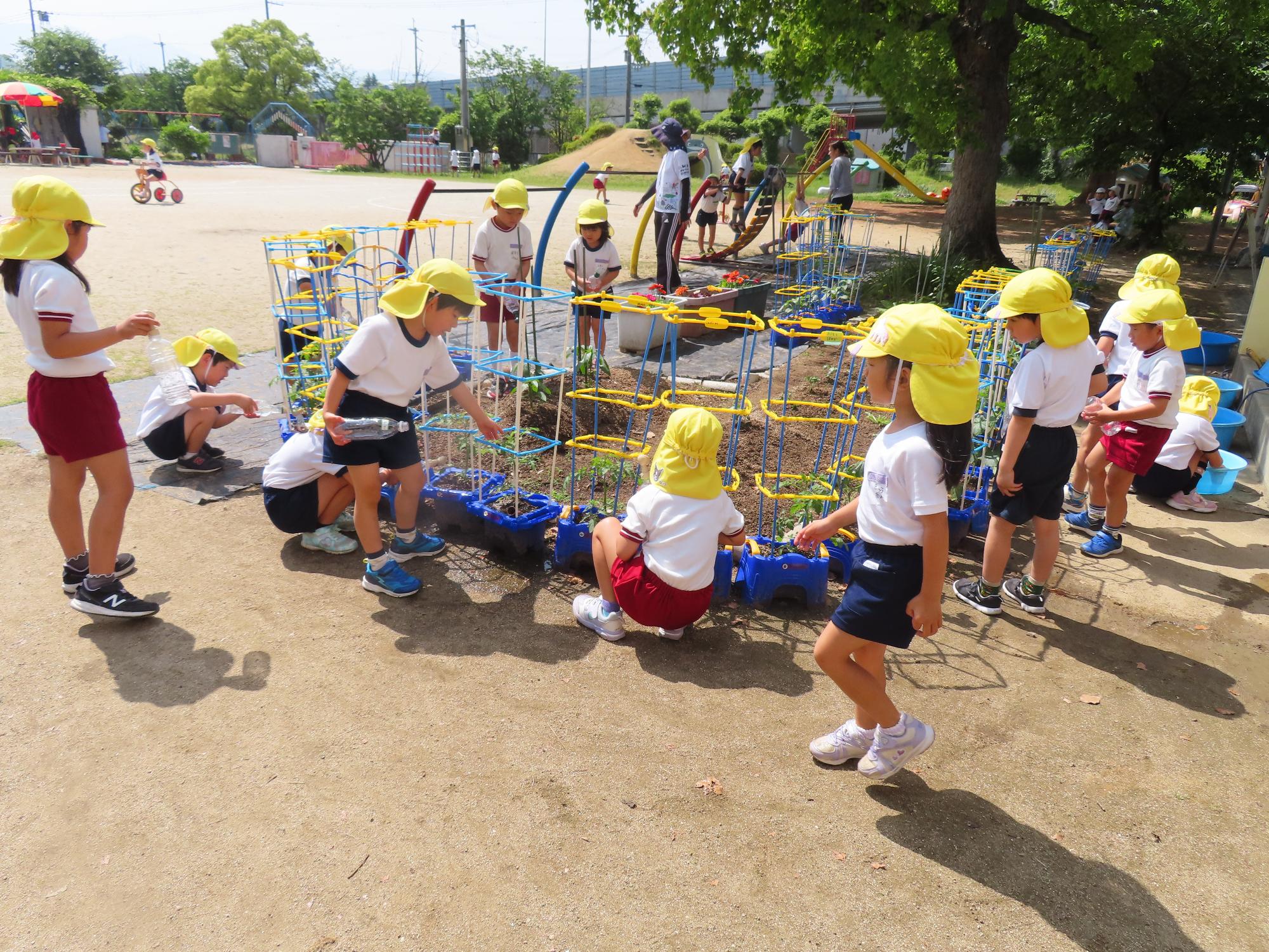 自然豊かな園庭では、春から秋にかけて、子どもたちが元気いっぱいに虫取りをしたり、花や実を集めたりして楽しく遊んでいます。笑顔いっぱいにお店屋さんごっこを楽しむ子どもたちやアスレチックなどで元気に体を動かす子どもたちで幼稚園は活気にあふれています。