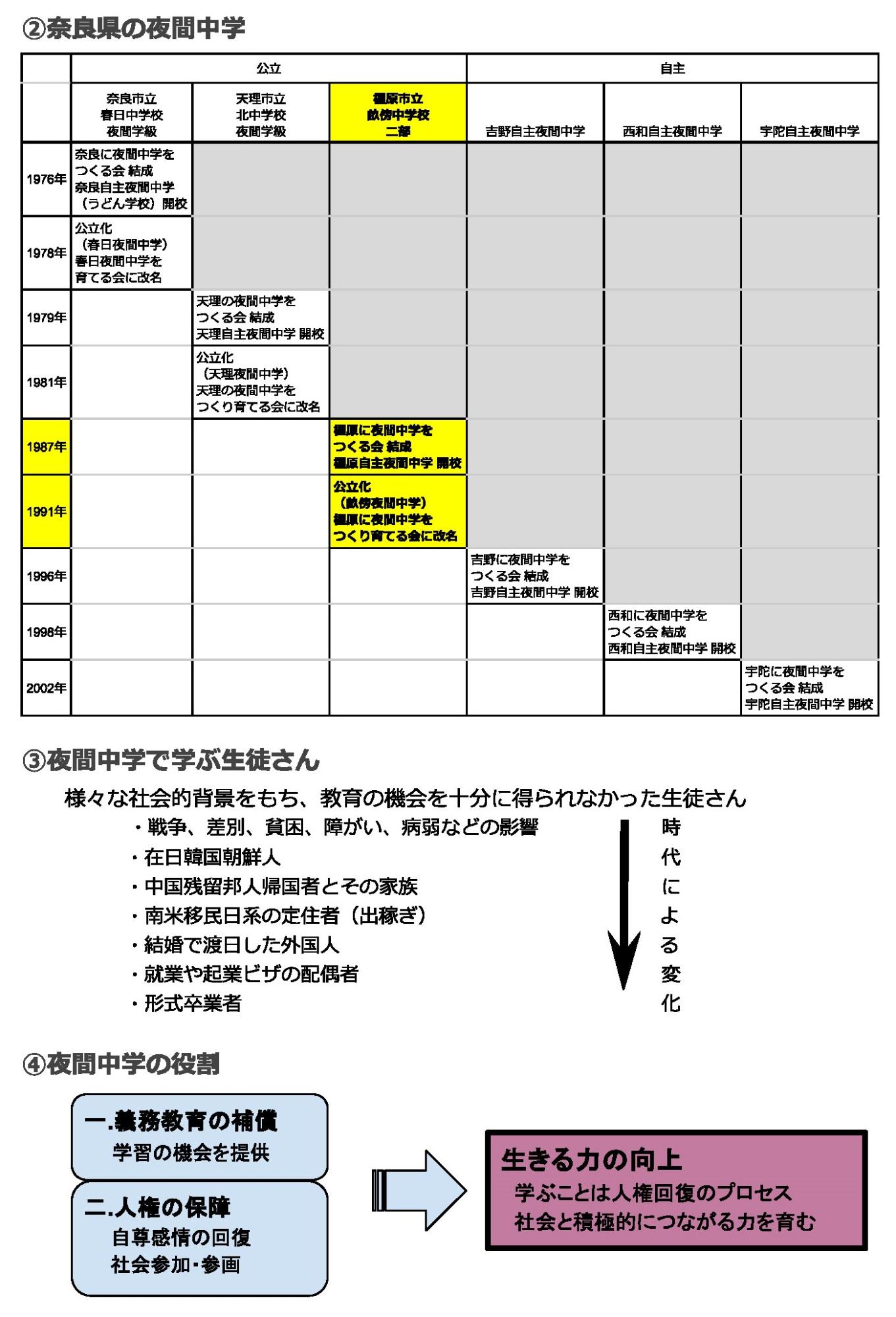 畝傍夜間中学校(うねびやかんちゅうがっこう)では、そのことを大切(たいせつ)にしながら生徒(せいと)さん達(たち)の生活(せいかつ)に密着(みっちゃく)した、そして、工夫(くふう)を凝(こ)らした授業(じゅぎょう)に全(ぜん)スタッフが取(と)り組(く)んでいます。