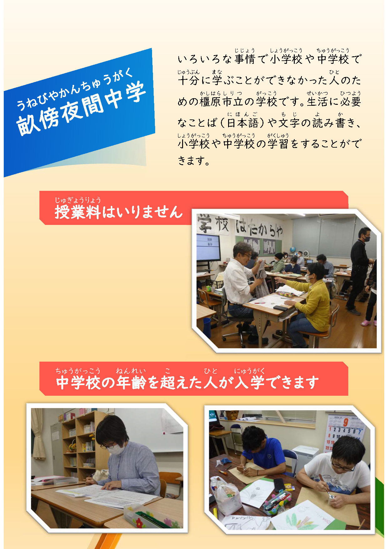- さまざまな理由(りゆう)で義務教育(ぎむきょういく)を十分(じゅうぶん)に受(う)けられなかったり、修了(しゅうりょう)できなかった人(ひと)。