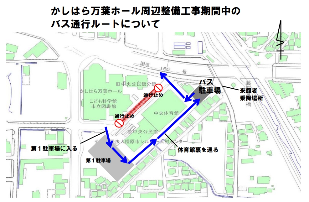 かしはら万葉ホールには約450台収容の無料駐車場があります。ただし、バス(大型・中型・マイクロ)の駐車スペースについては限りがありますので事前にご予約ください。なお、令和6年10月から令和8年3月の期間、かしはら万葉ホール周辺整備工事に伴い、万葉ホール前面道路の通行止めが生じる場合があります。その際、バスの駐車スペースへの経路は別添ファイルのとおりお願いします。通行止め期間については、以下のとおりです。